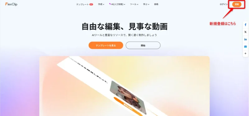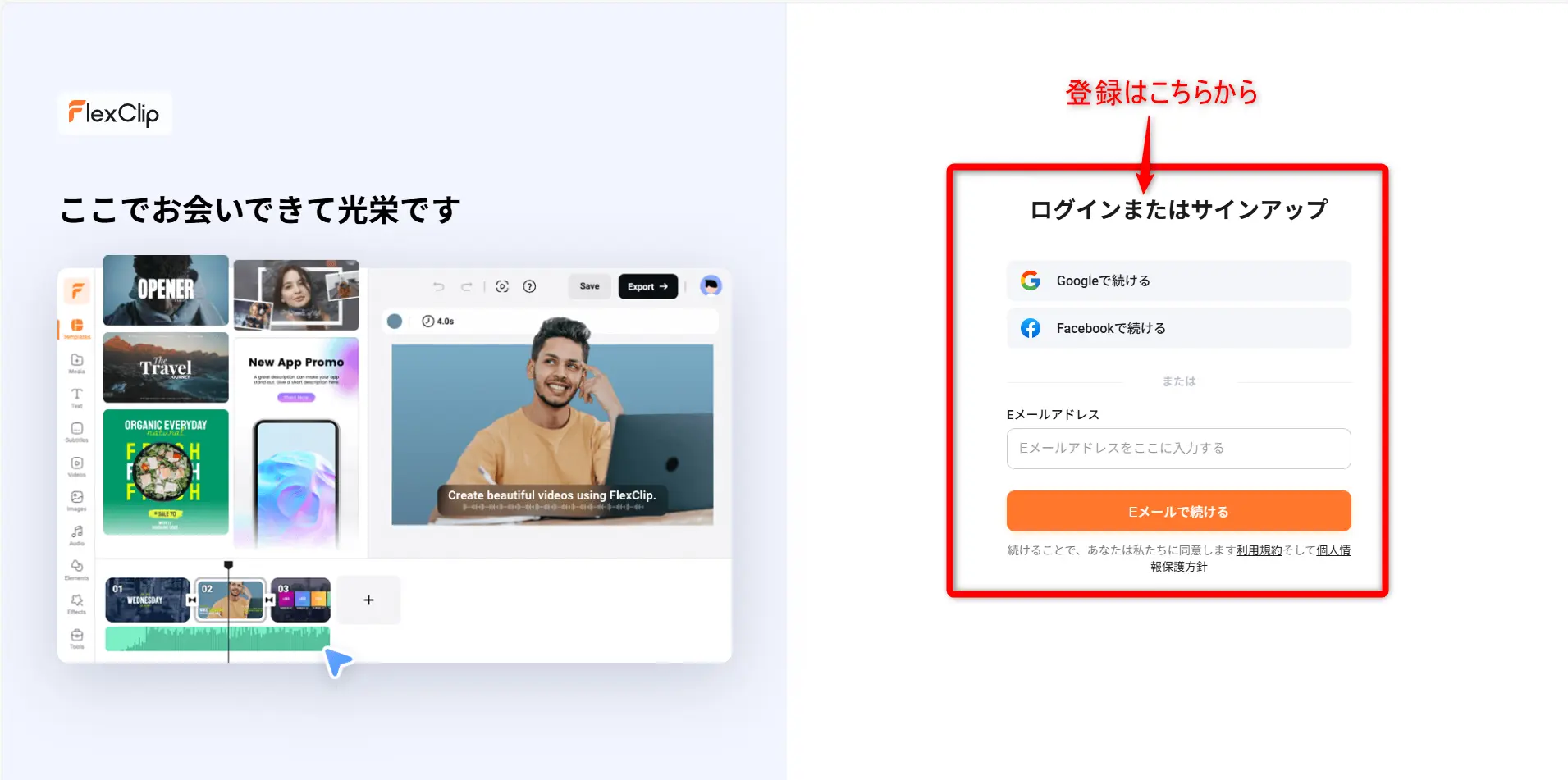 FlexClipを使うには、まずアカウントの作成が必要です。まだ持っていない方は、先に登録を済ませましょう。