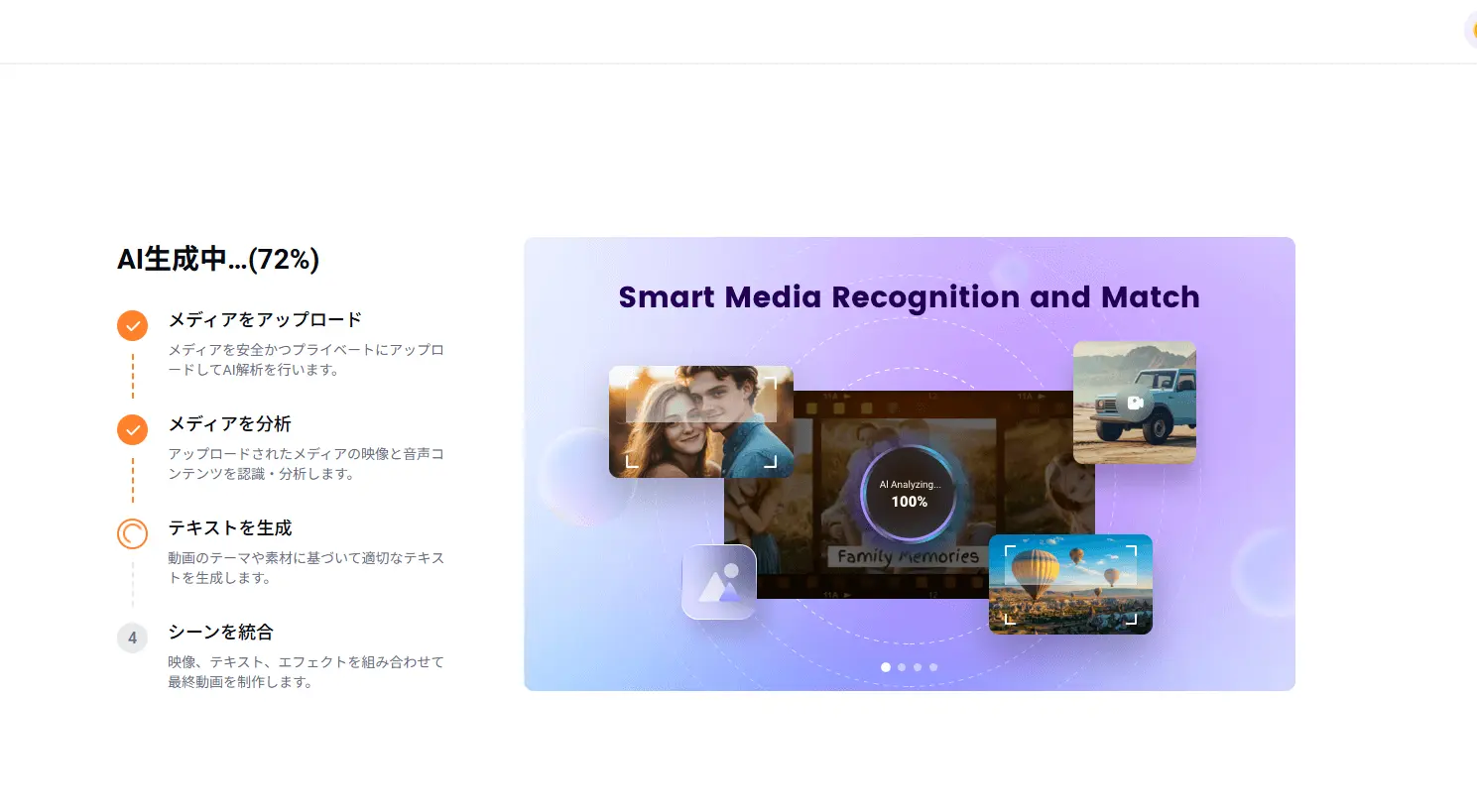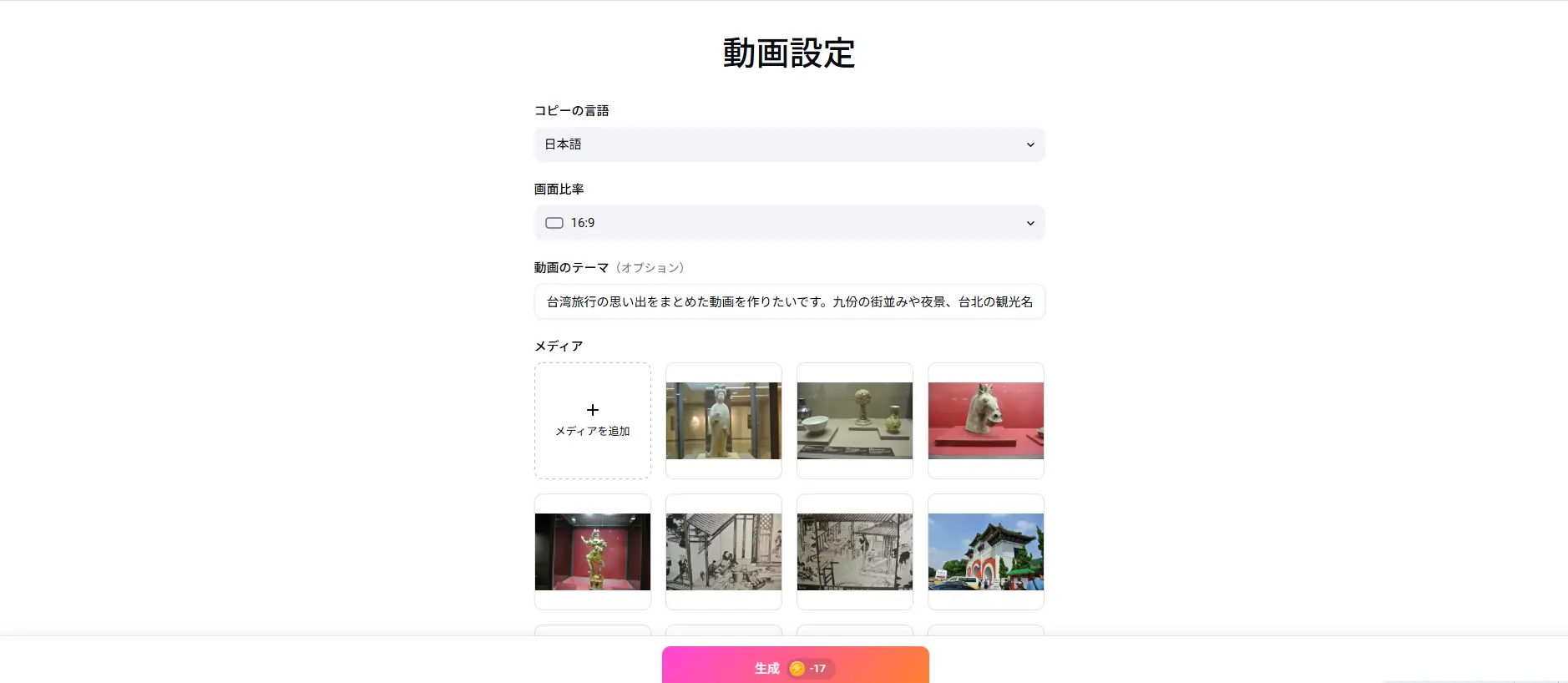 ここでは、AIに指示を入力すると、アップロードした画像や動画を自動的にまとめてくれます。細かな編集操作を行わなくても、基本的な構成が整った動画が生成されます。