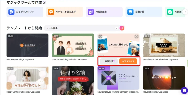 AI Recreate(AI再生成)こちらから あなたのイメージにあった、テンプレートを選んでください。
