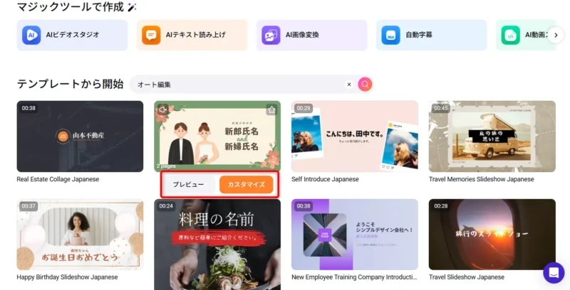 選んだテンプレートにポイターをあわせると「プレビュー」と「AI再生成」のポップアップが出ますので