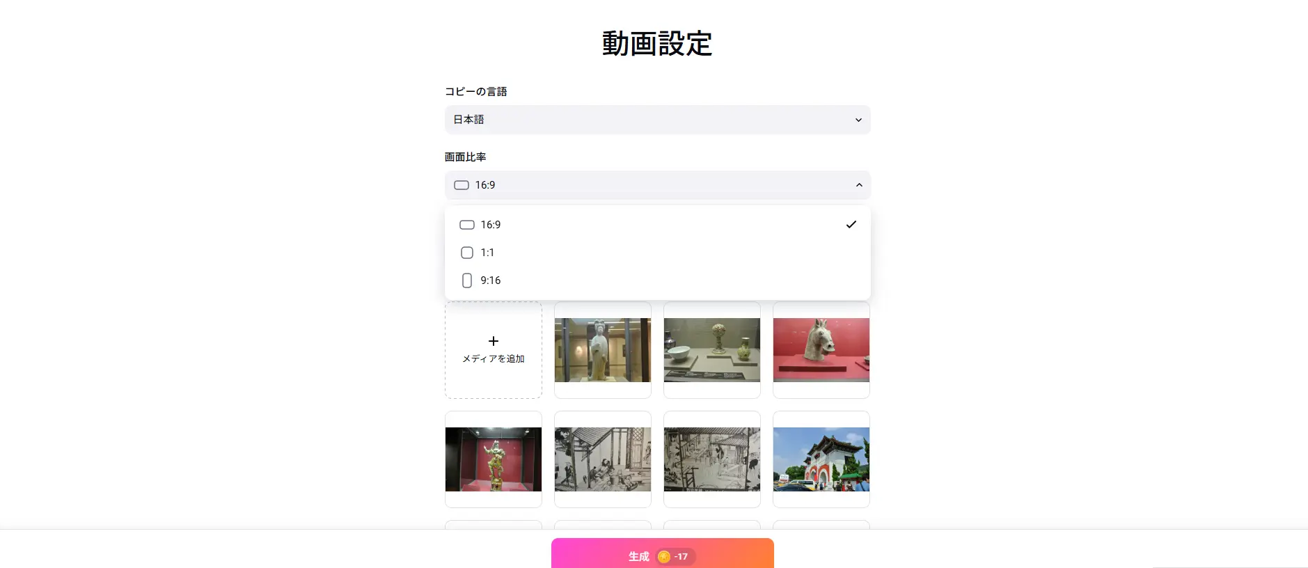 画像サイズは、編集画面から「16:9」「1:1」「9:16」へワンクリックで切り替えられます。